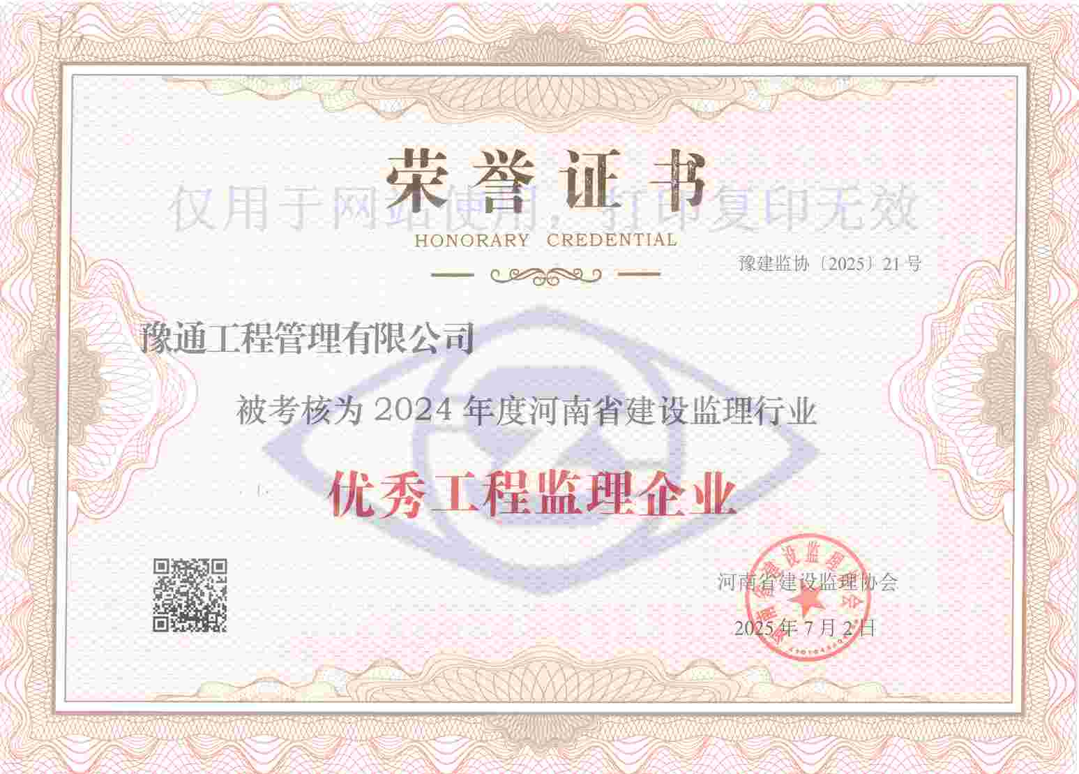 我公司连续多年荣获该荣誉,这是协会及社会各界对公司工作成效的高度肯定,更是对我们未来发展征程的激励和鞭策。我们将以此为动力,不断提升核心能力,持续提供高品质、全方位的技术服务,倾力监造更多精品工程,为河南建设监理行业高质量发展贡献更多专业力量。